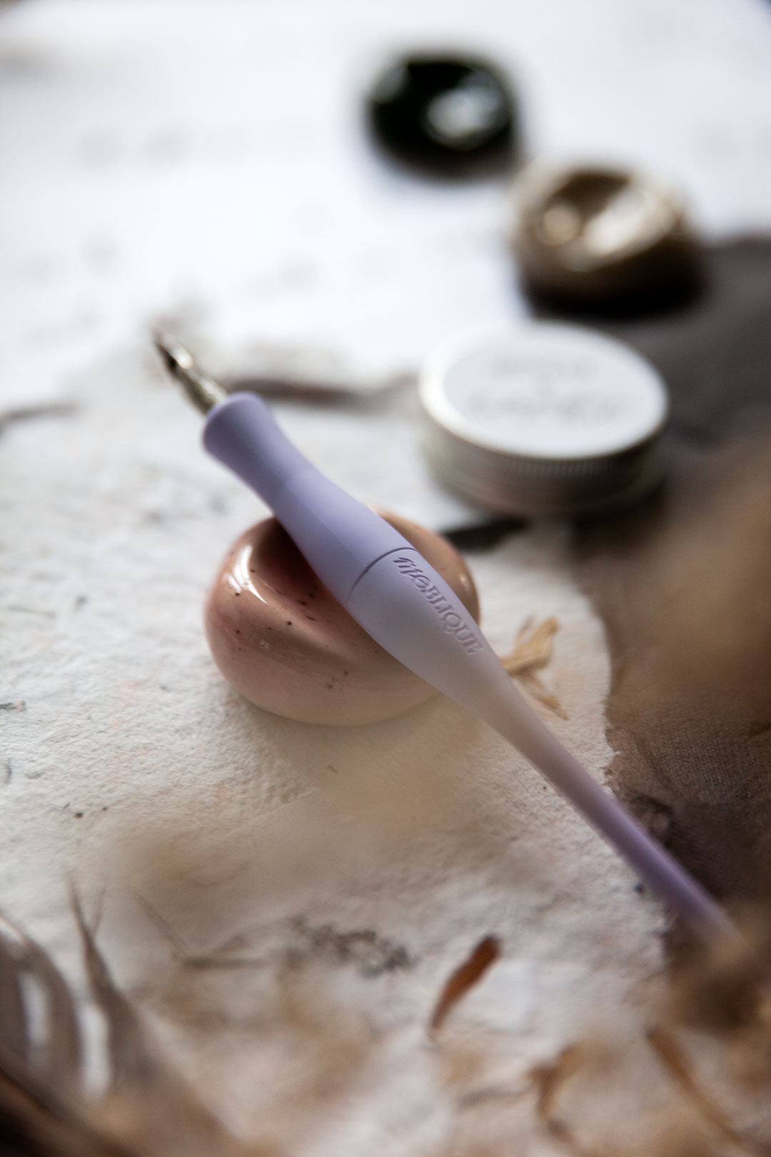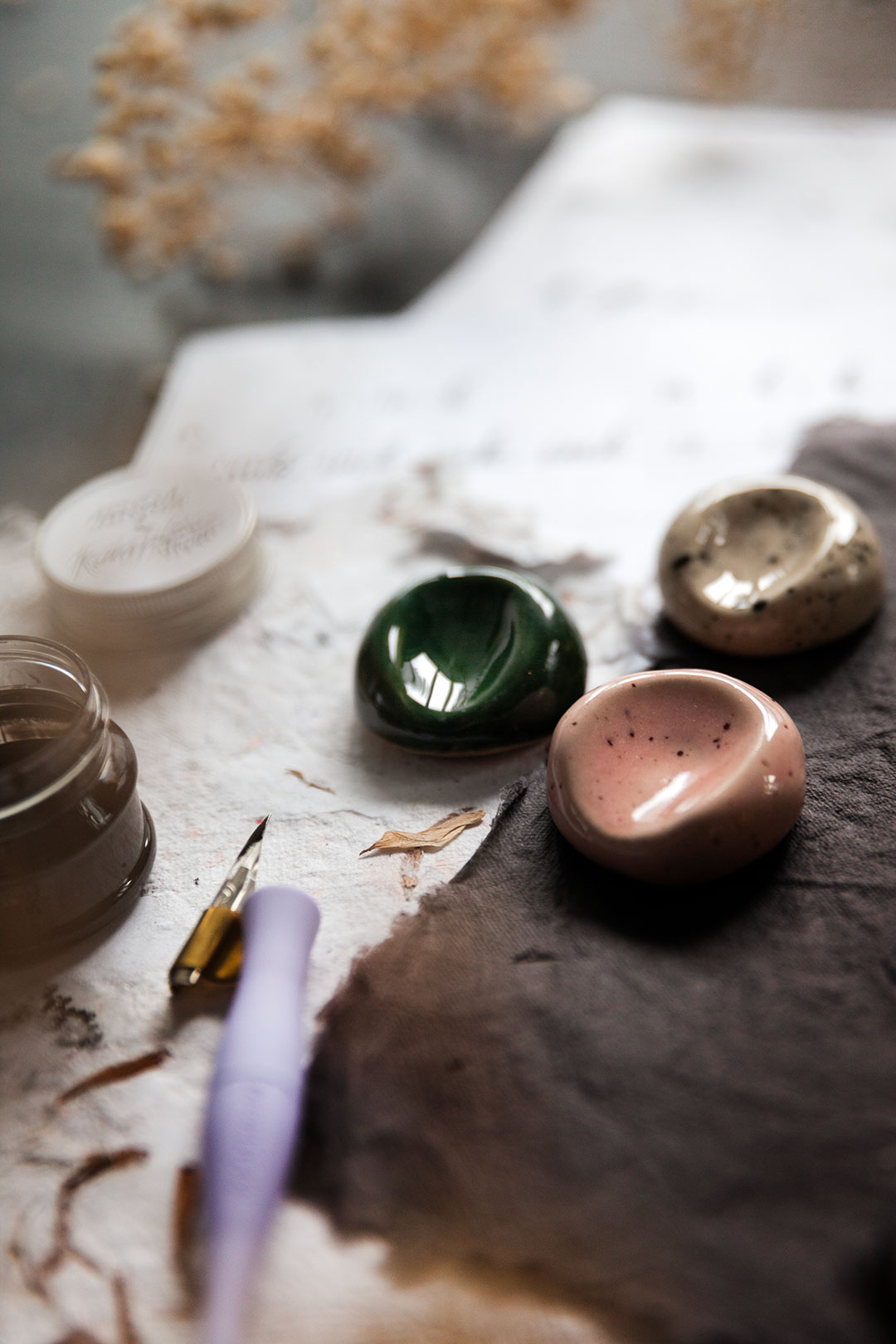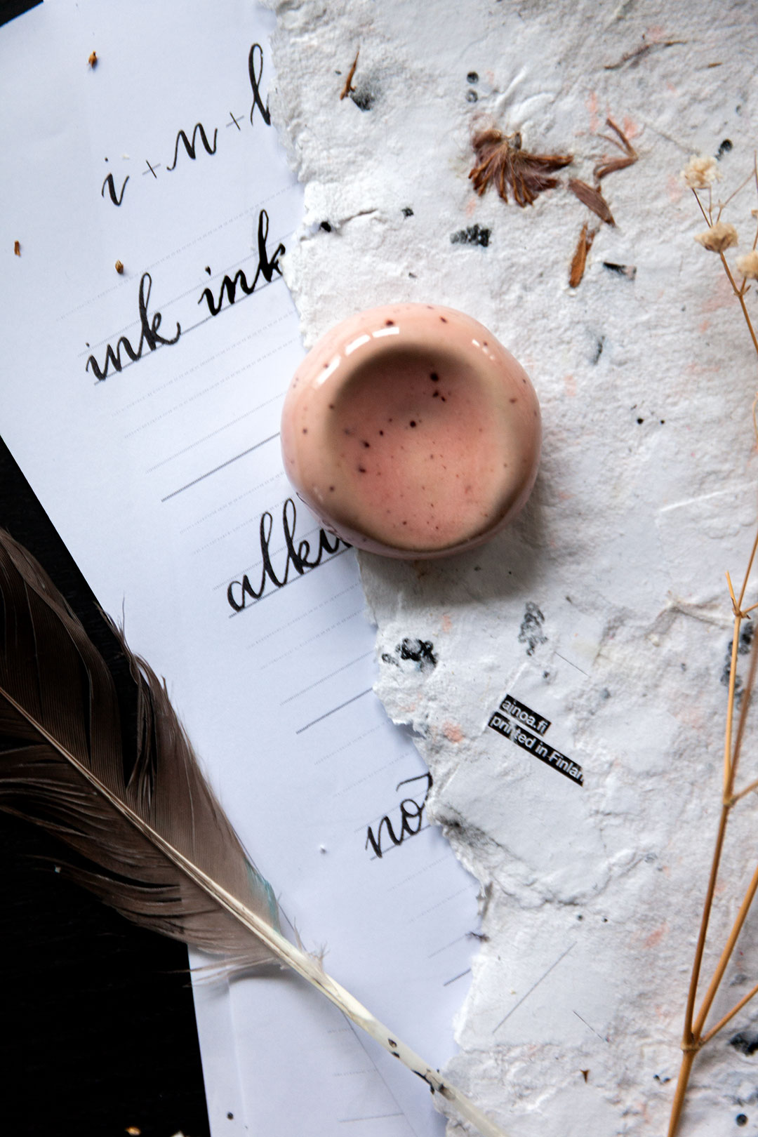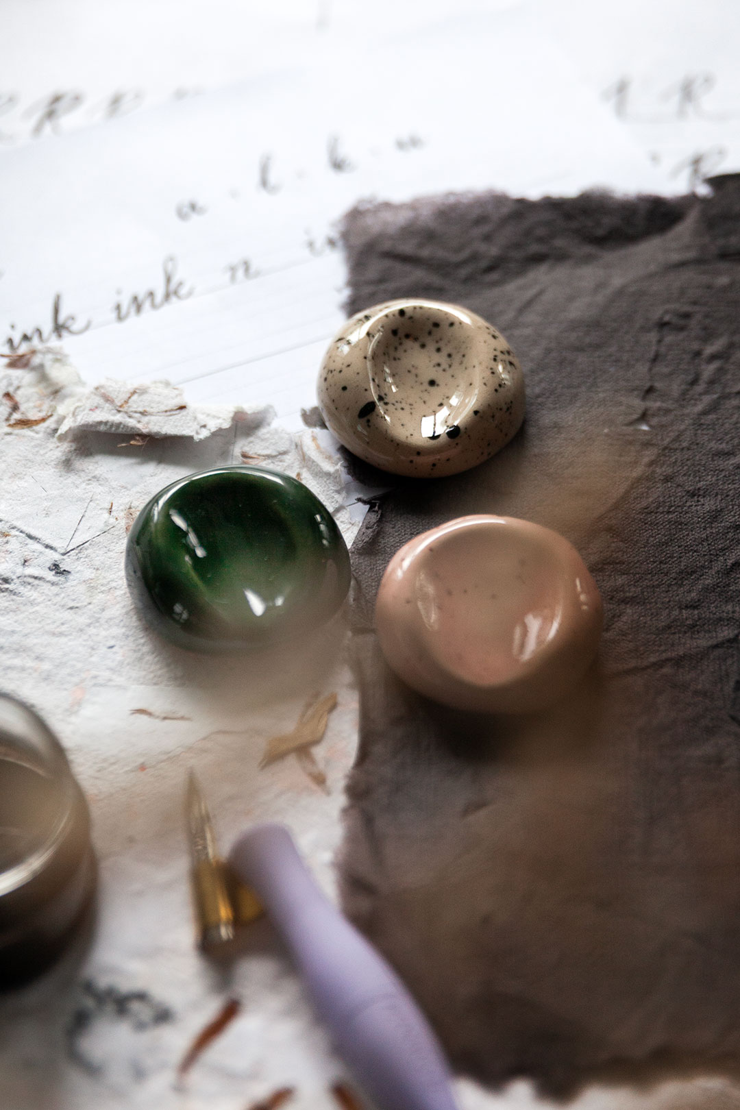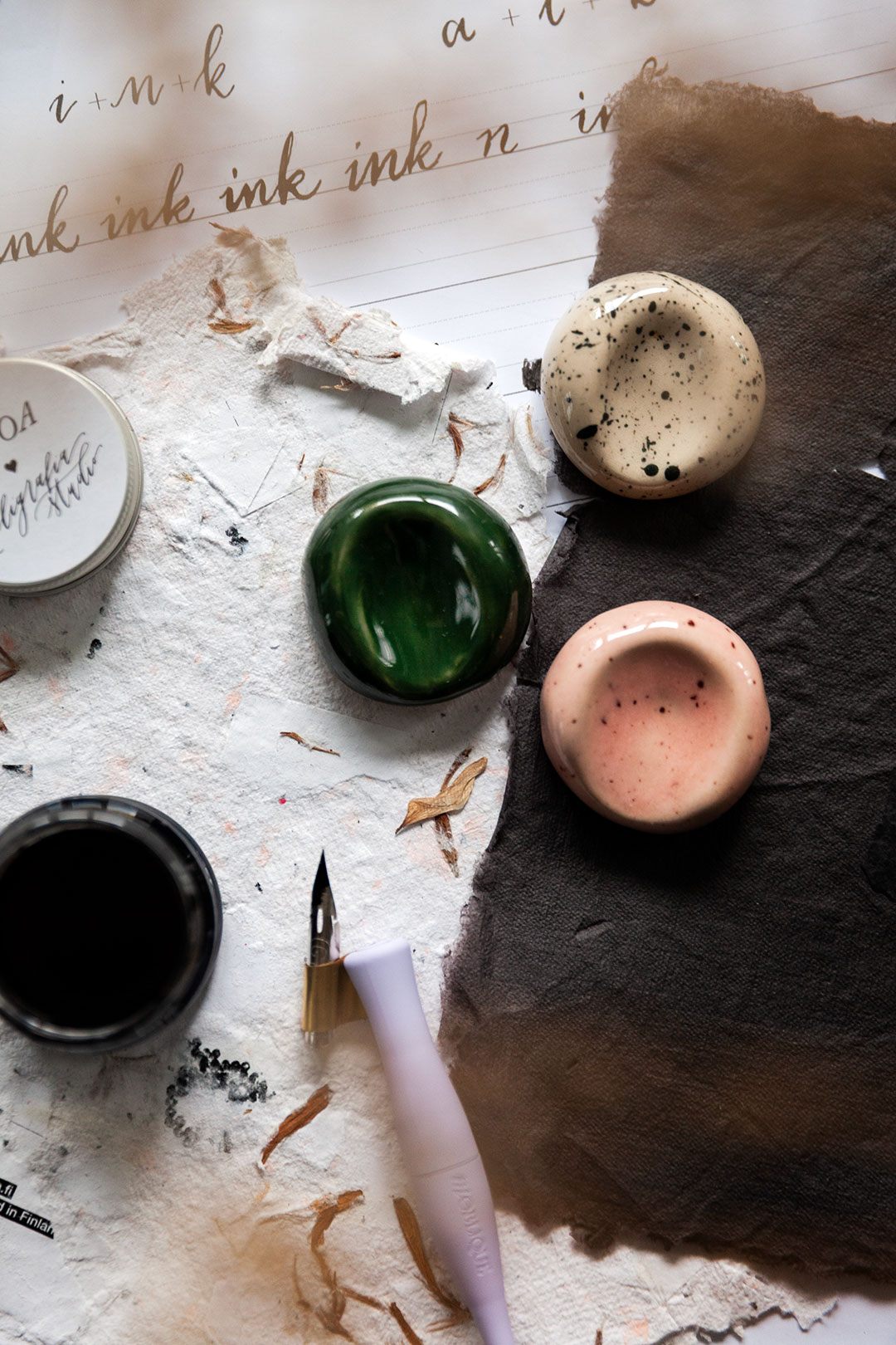 Me haluttiin luoda jotain aivan ihanaa, joka tekisi sun kalligrafiahetkistä vielä spesiaalimpia. Niin syntyi ajatus käsin muotoilluista kynänlepuuttajista, joissa voit aistia sen tehneen henkilön peukalon painauman ja varmasti myös sen ilon ja innostuksen, jota oli ilmassa kun kokoonnuimme näitä Keramiikkastudio Savenille Helsingin Pitäjänmäkeen tekemään.