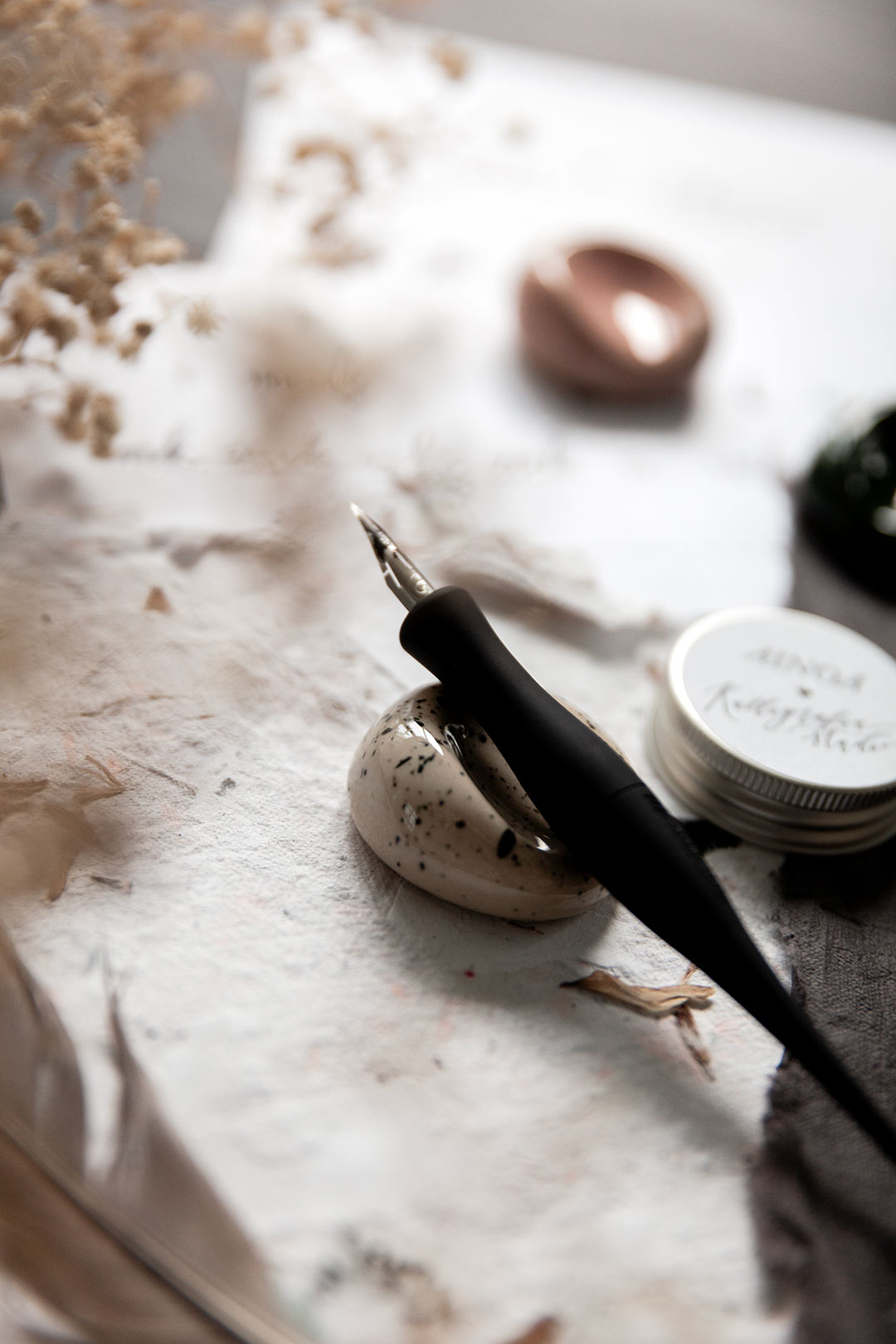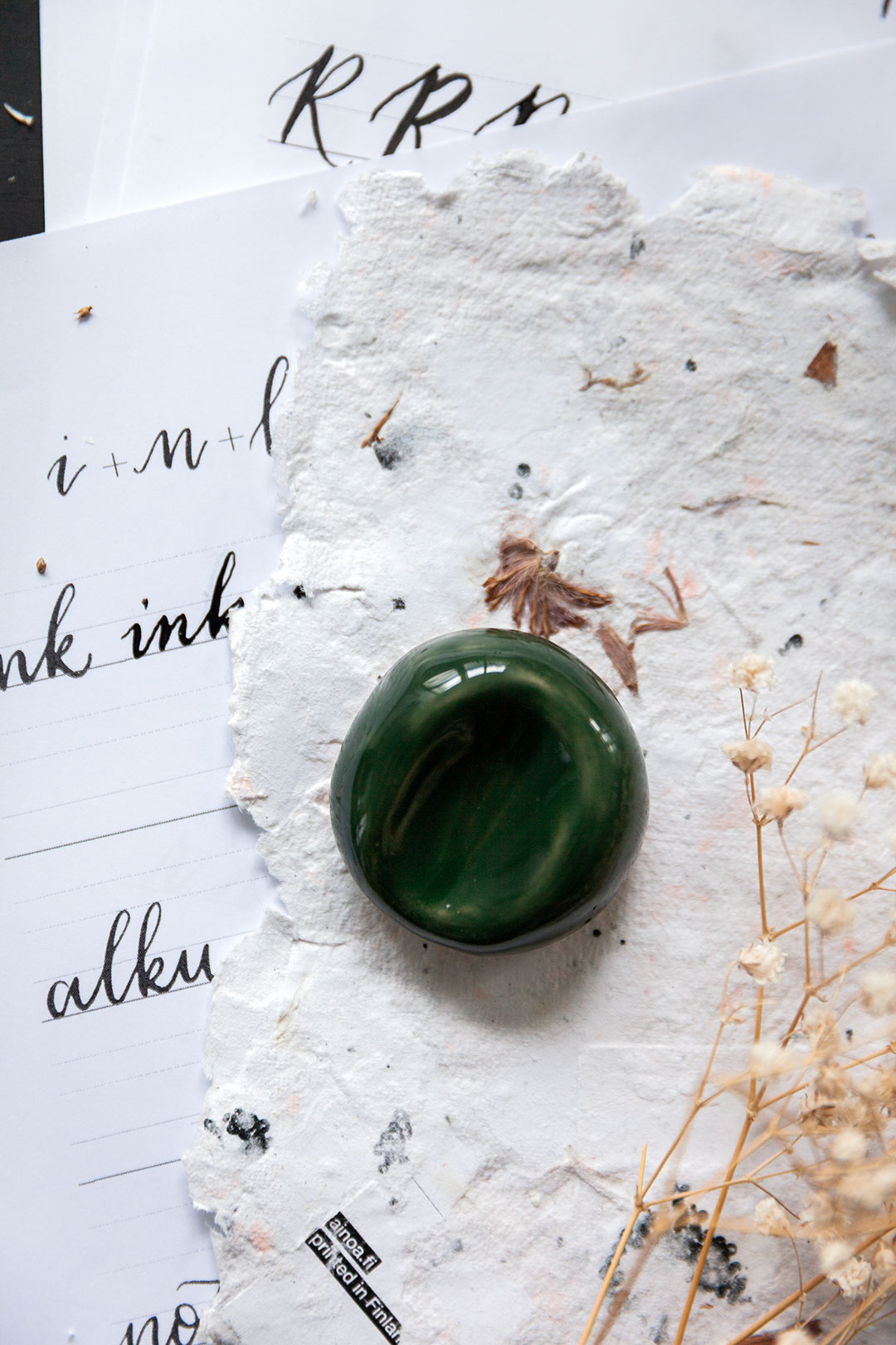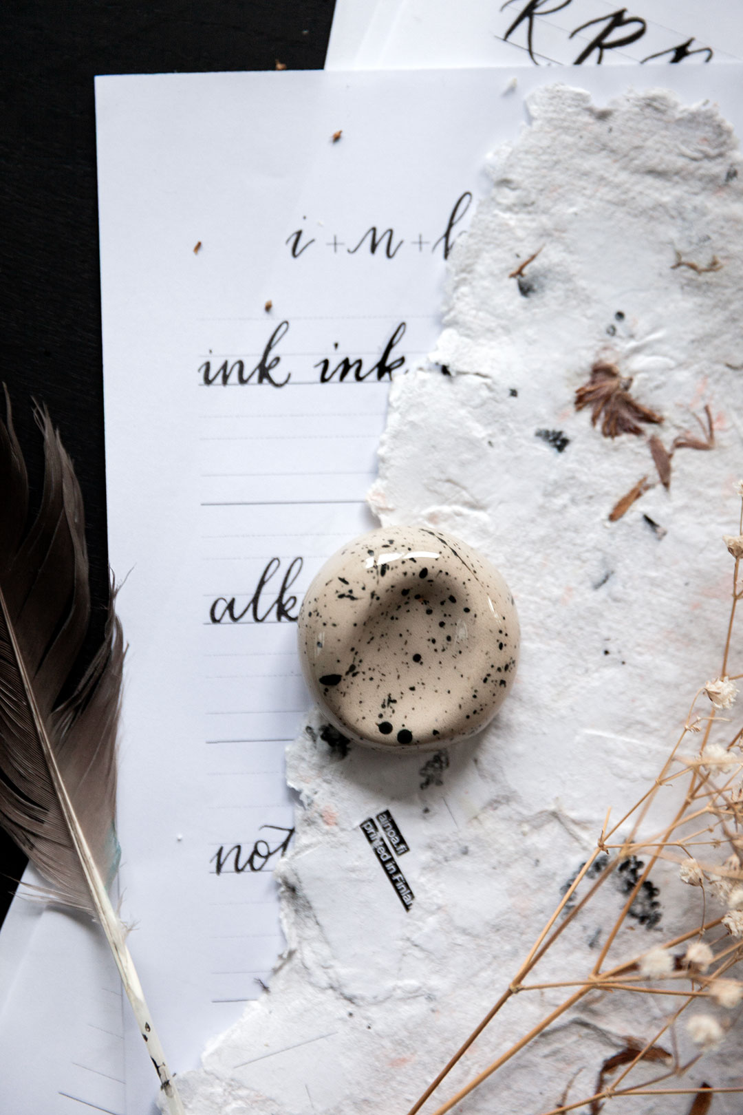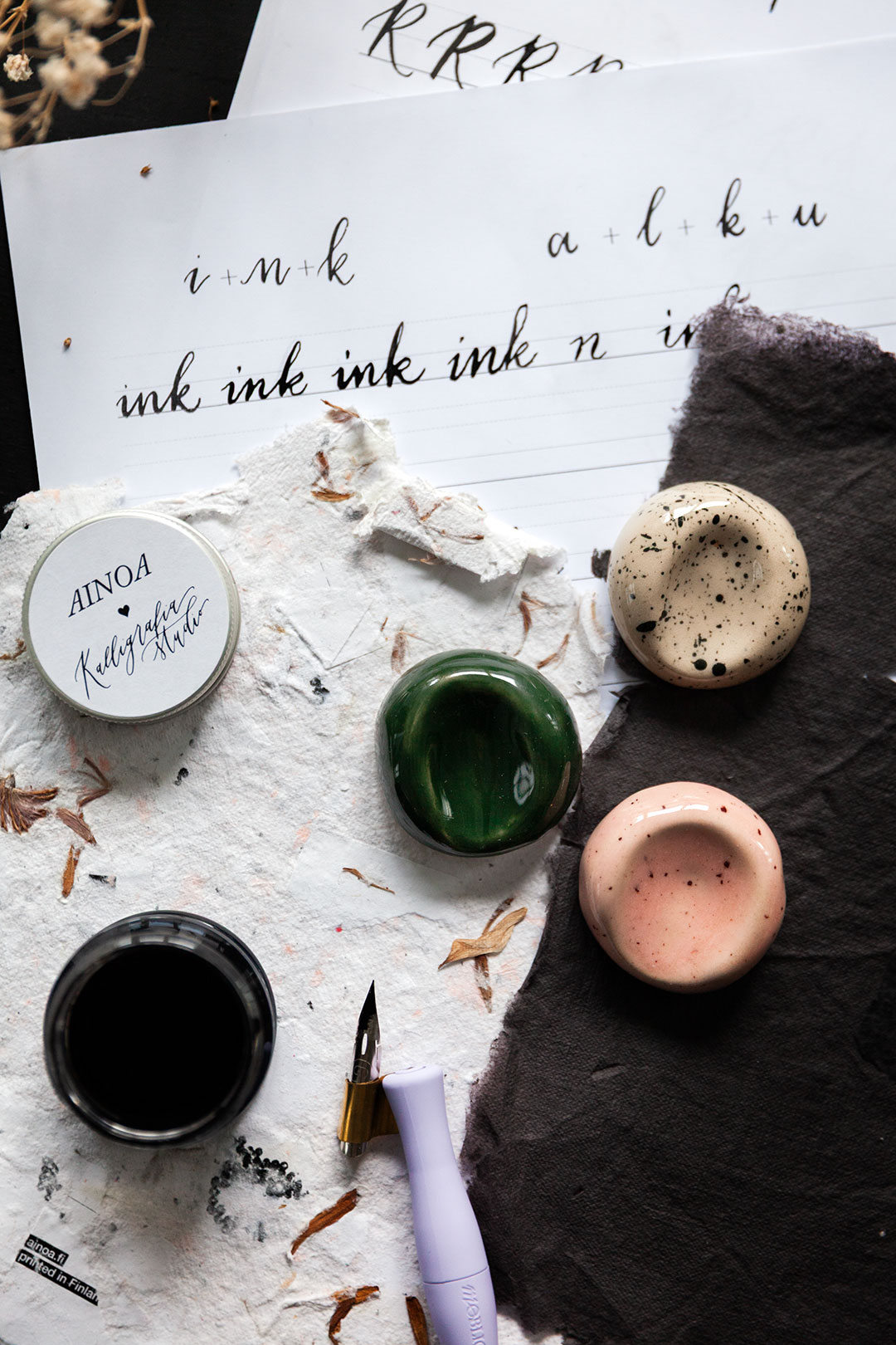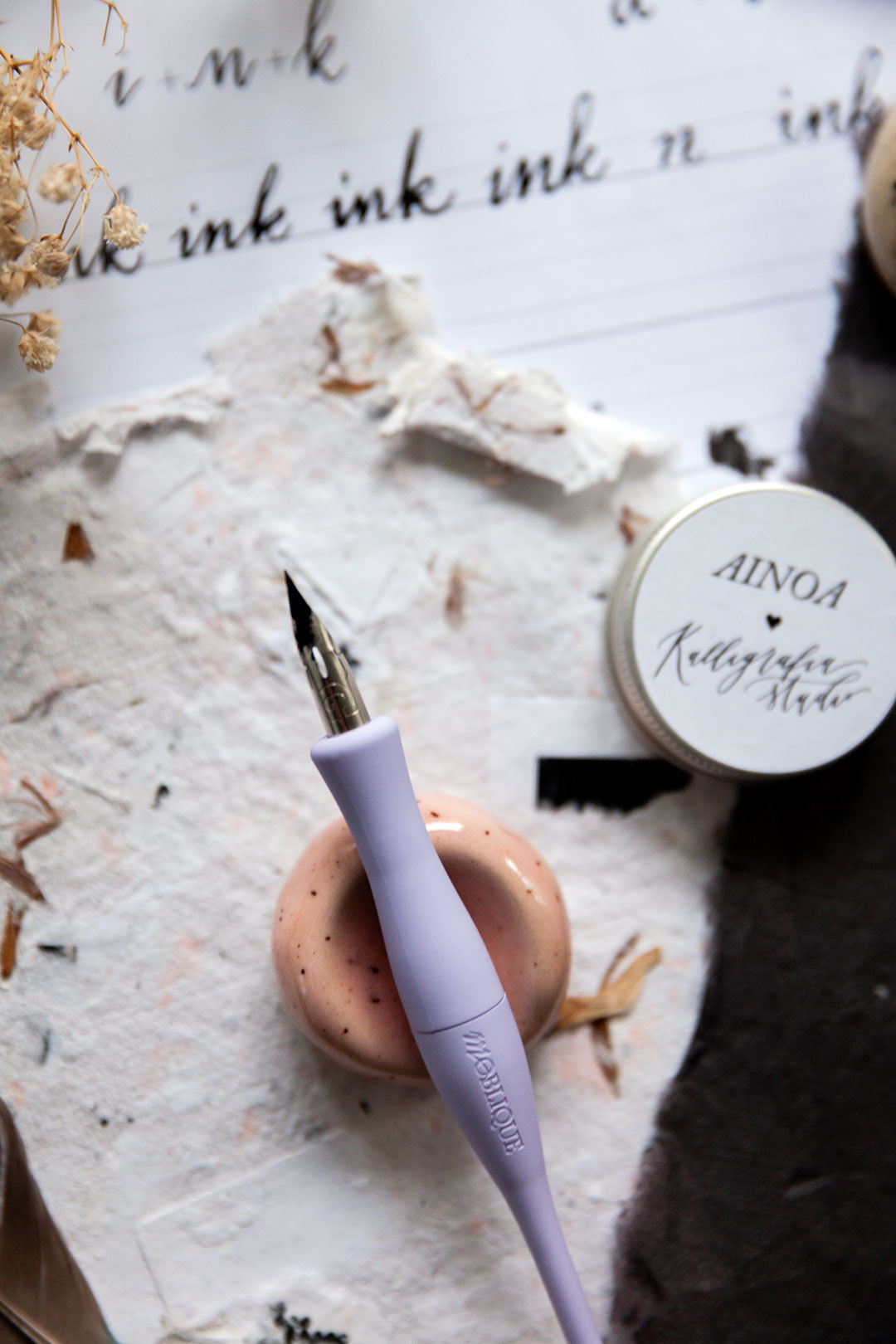 Me haluttiin luoda jotain aivan ihanaa, joka tekisi sun kalligrafiahetkistä vielä spesiaalimpia. Niin syntyi ajatus käsin muotoilluista kynänlepuuttajista, joissa voit aistia sen tehneen henkilön peukalon painauman ja varmasti myös sen ilon ja innostuksen, jota oli ilmassa kun kokoonnuimme näitä Keramiikkastudio Savenille Helsingin Pitäjänmäkeen tekemään.