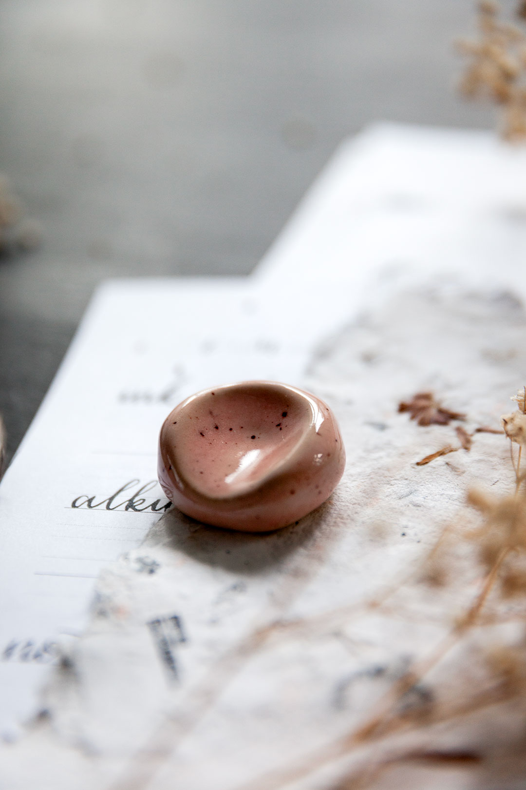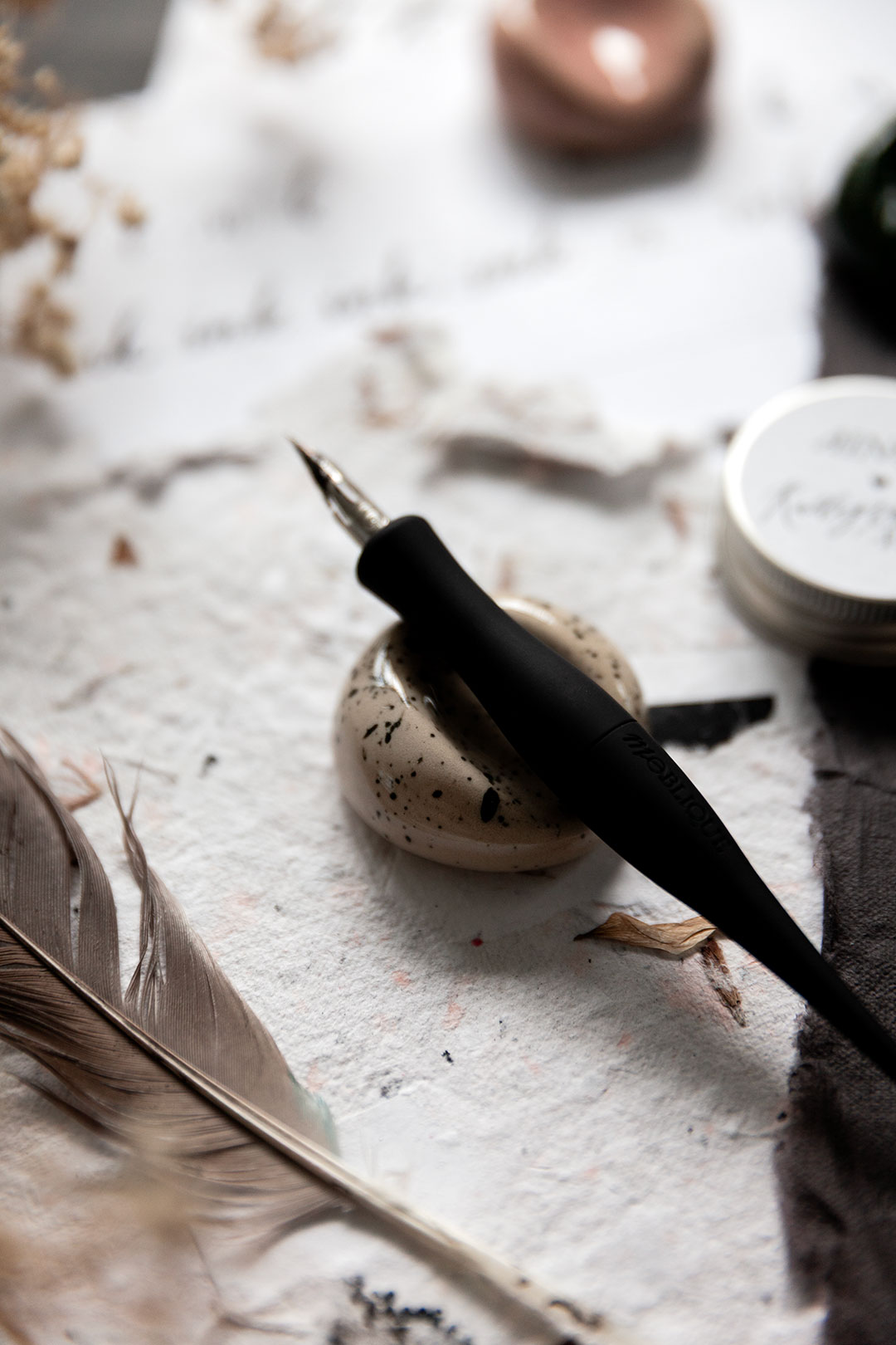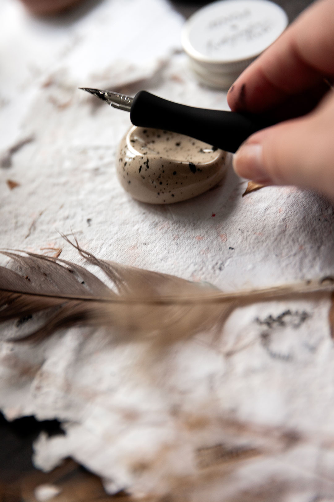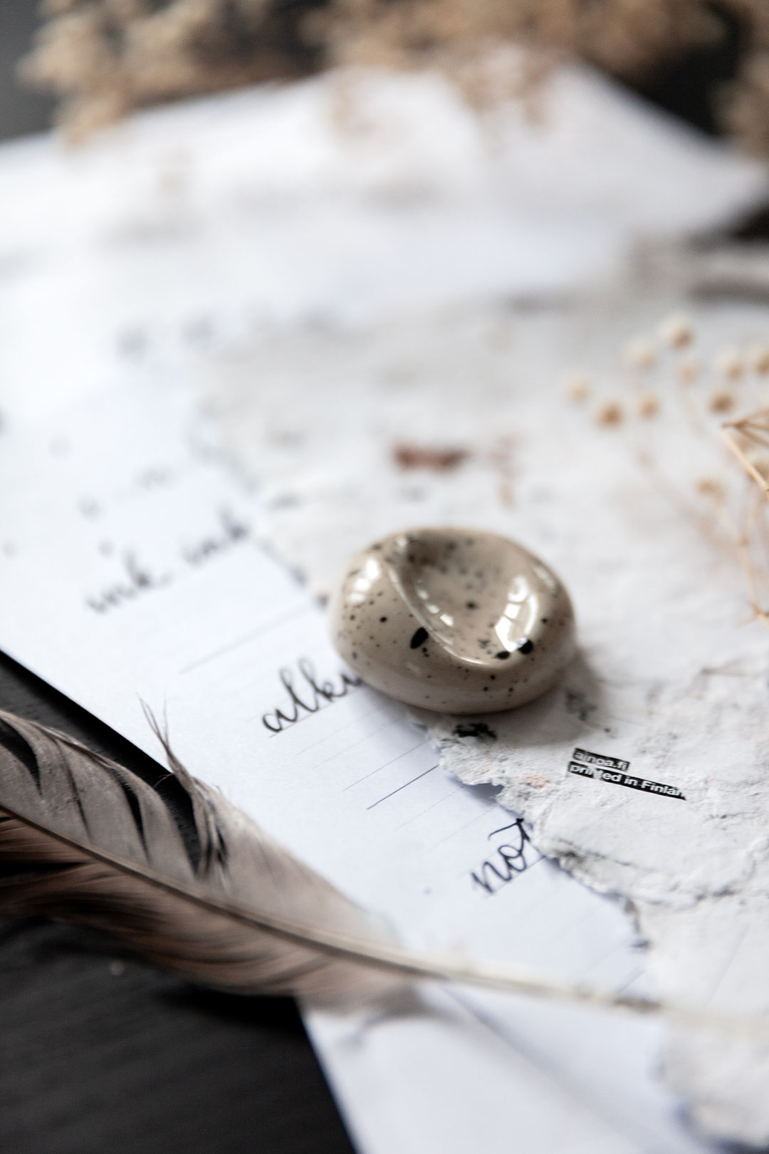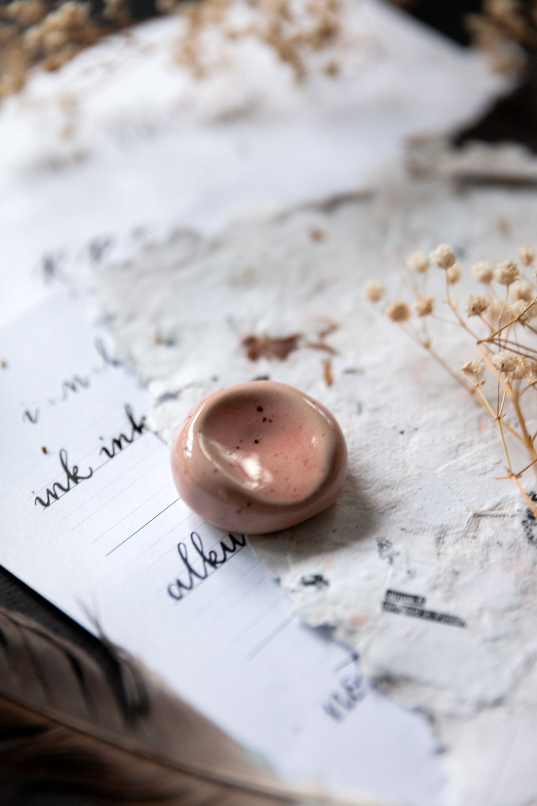 Me haluttiin luoda jotain aivan ihanaa, joka tekisi sun kalligrafiahetkistä vielä spesiaalimpia. Niin syntyi ajatus käsin muotoilluista kynänlepuuttajista, joissa voit aistia sen tehneen henkilön peukalon painauman ja varmasti myös sen ilon ja innostuksen, jota oli ilmassa kun kokoonnuimme näitä Keramiikkastudio Savenille Helsingin Pitäjänmäkeen tekemään.