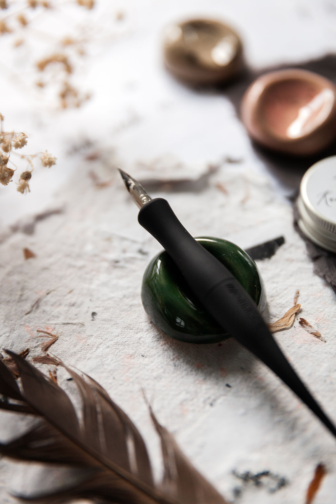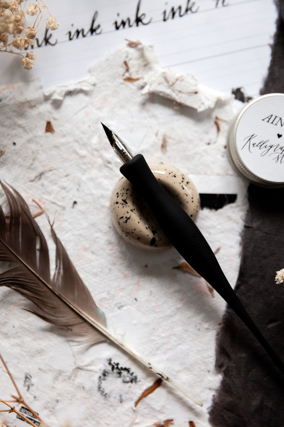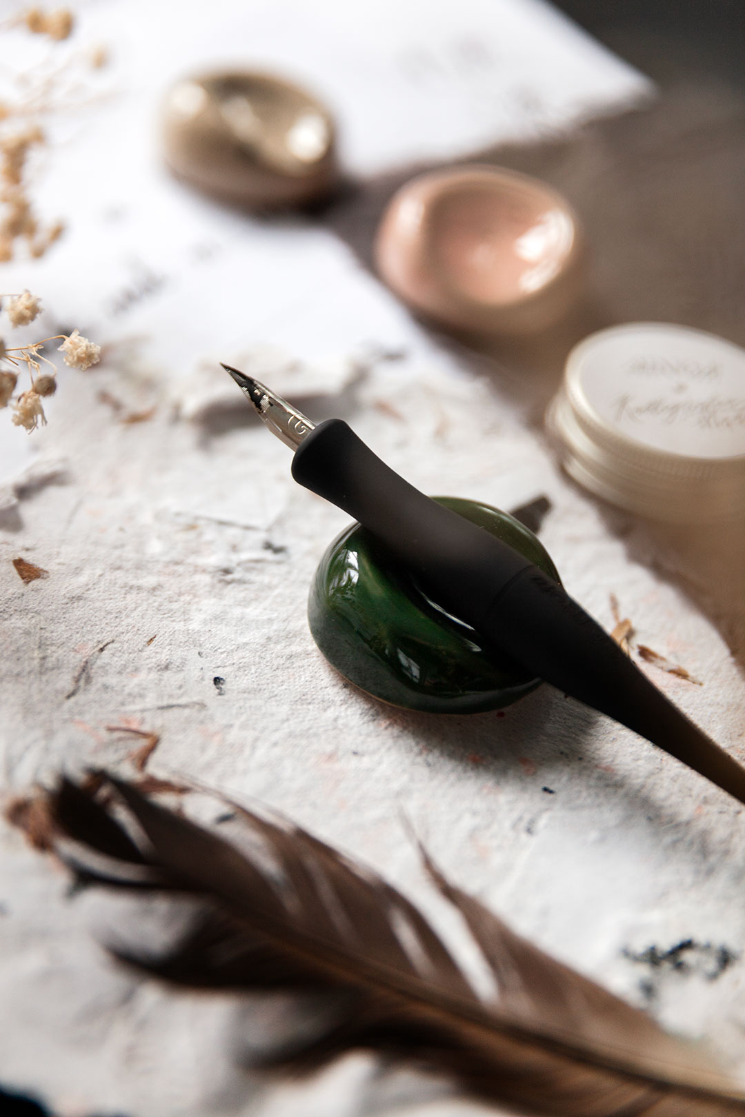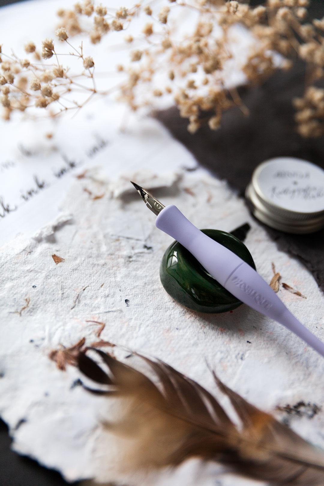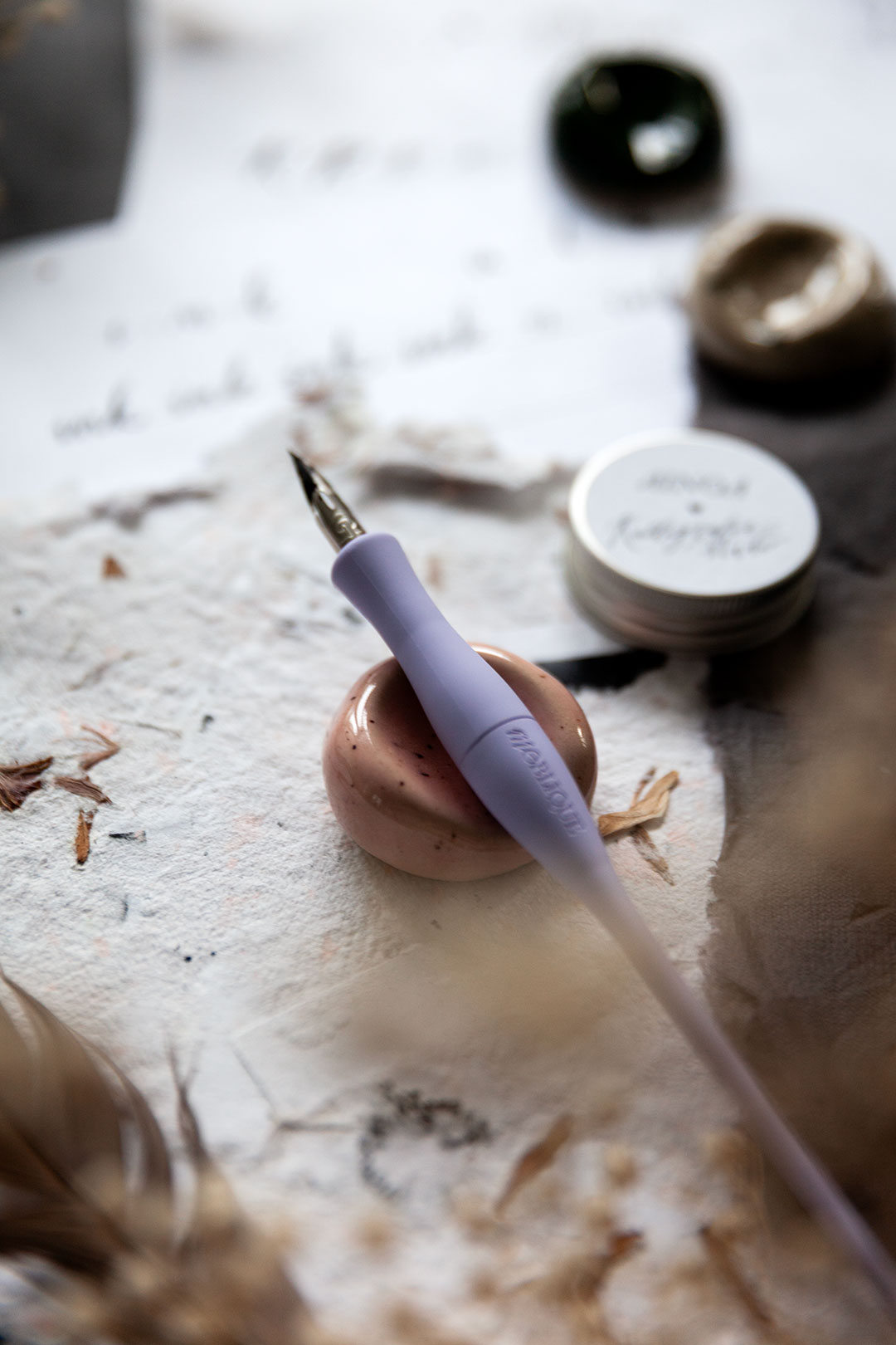 Lepuuttaja on kalligrafiakynälle sopiva kaunis ja kätevä levähdyspaikka, joka estää mustetahrat ja kynän pyörimisen ympäriinsä.